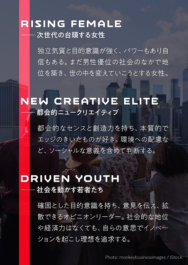 ポルシェはグローバルで、タイカンのユーザー像を共有している。ここでは、既存のポルシェオーナーとは別に、次世代のユーザーとして3つのキーワードが挙げられている。