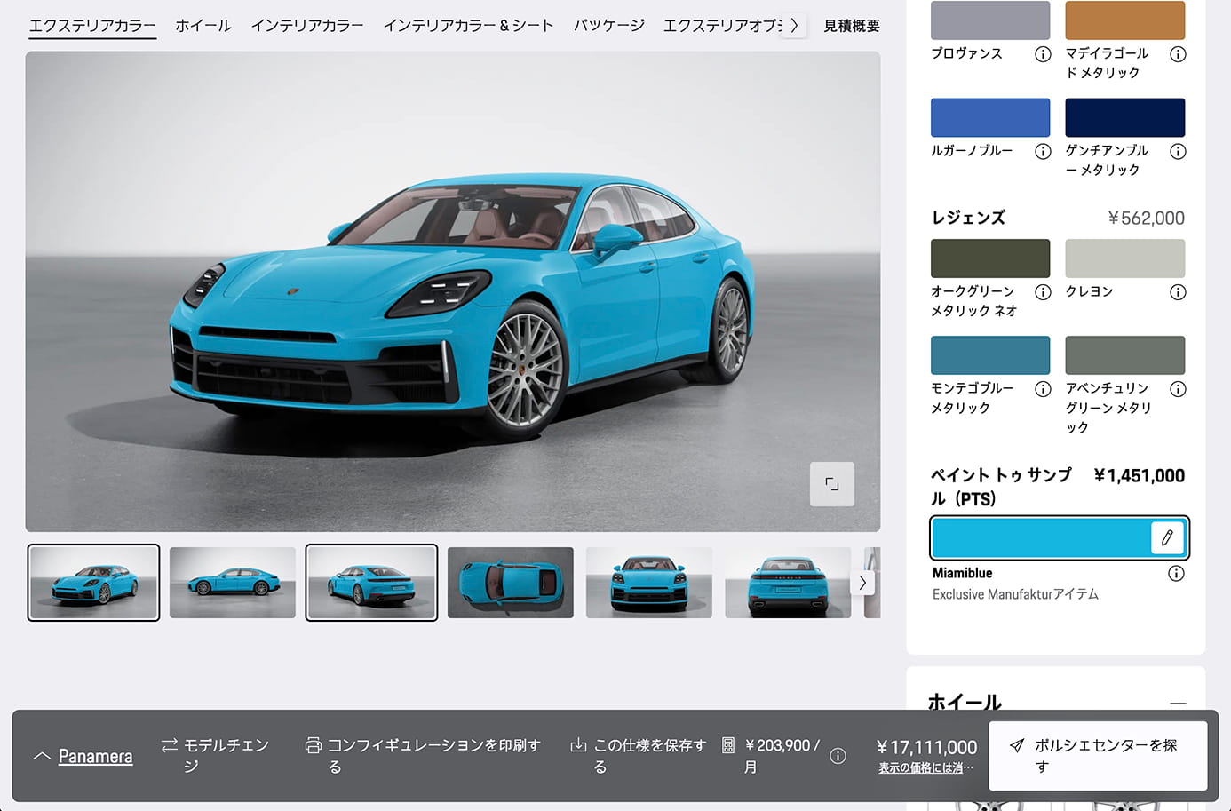 ポルシェ カーコンフィギュレーターを使用すれば、新型Panameraをさらに具体的にイメージすることが可能です。ボディや内装の色だけでなく、様々なオプションを選択して、理想の1台をつくってみませんか?