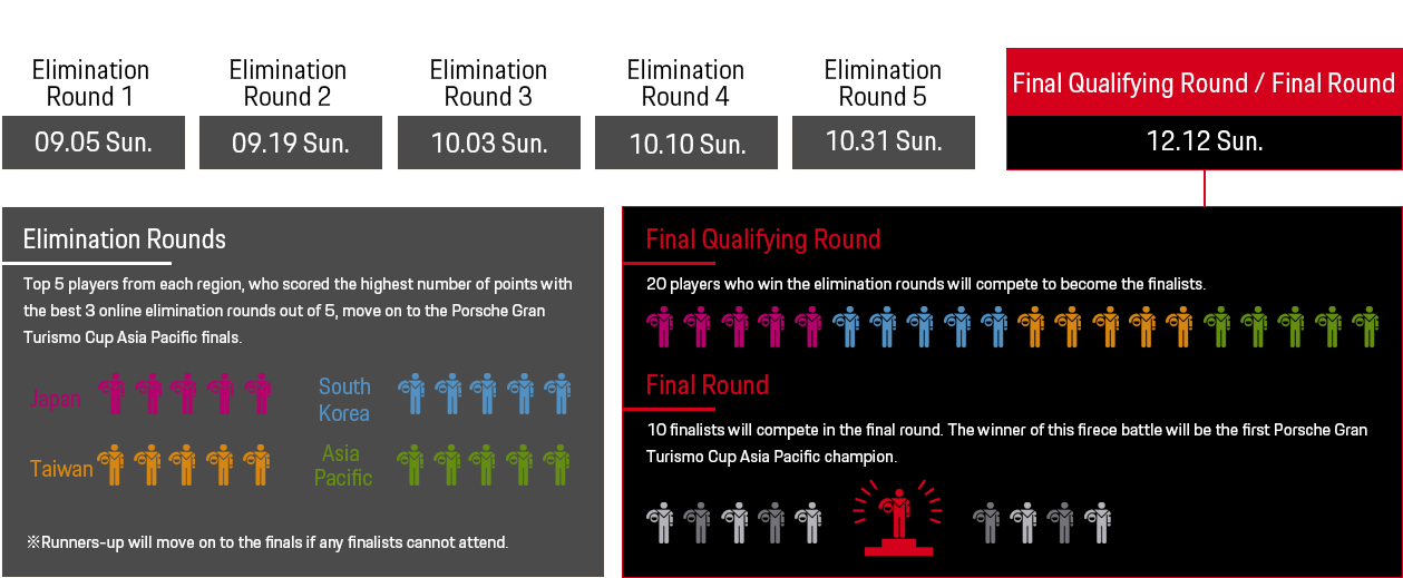 This year, the Esports Tournament expands to a wider region in Asia including Japan, South Korea Taiwan and various countries in Asia Pacific. Participants who enter the competition need to qualify for the finals in five elimination rounds. The best 5 players from each region and a total of 20 players who scored the highest points, move on to the next elimination round. After the final elimination round, the 10 best players consisting of the 4 best players from each region and the top 6 players from all regions, qualify for the finale. The finale on 12th December determines the overall winner out of the 10 finalists. The glorious first champion of the Porsche Gran Turismo Cup Asia Pacific will be invited to the Porsche Experience Centre Tokyo for an unforgettable full day track experience.